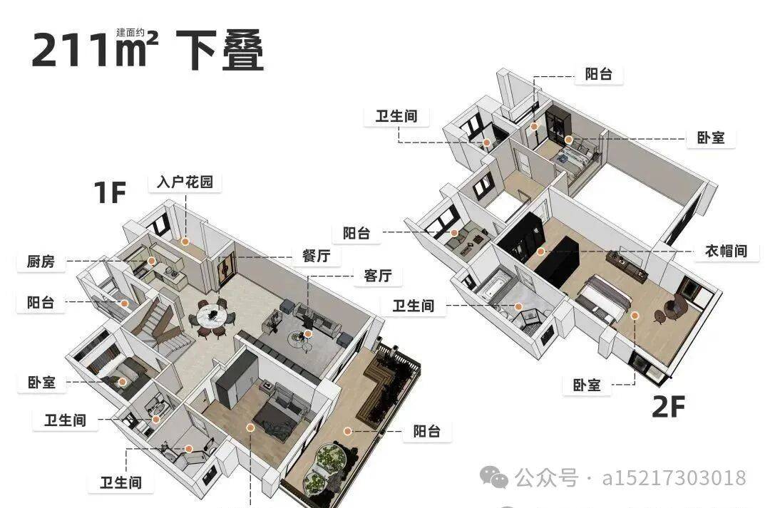下叠户型建面约211㎡,但注意了,它自带有超大花园,面积媲美一个小户型!