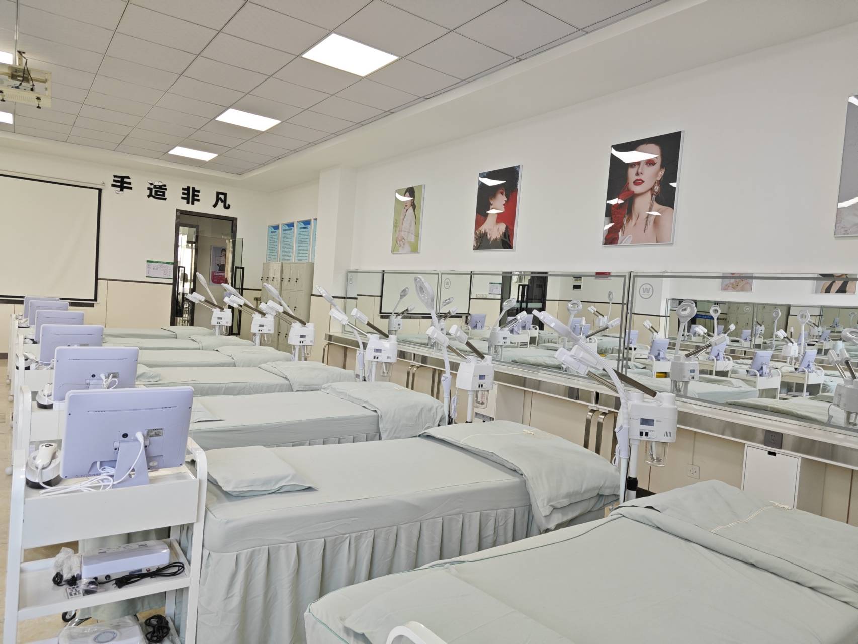 :建有模拟美容院、专业美发沙龙、美甲美睫工作室、化妆造型实训室等专属场地,1:1还原线下门店真实服务场景,配备行业主流品牌美容仪、专业美发工具、全品类彩妆产品等实训设备,实训课时占比超70%,以真人实操、模拟客户服务等方式强化技能掌握。