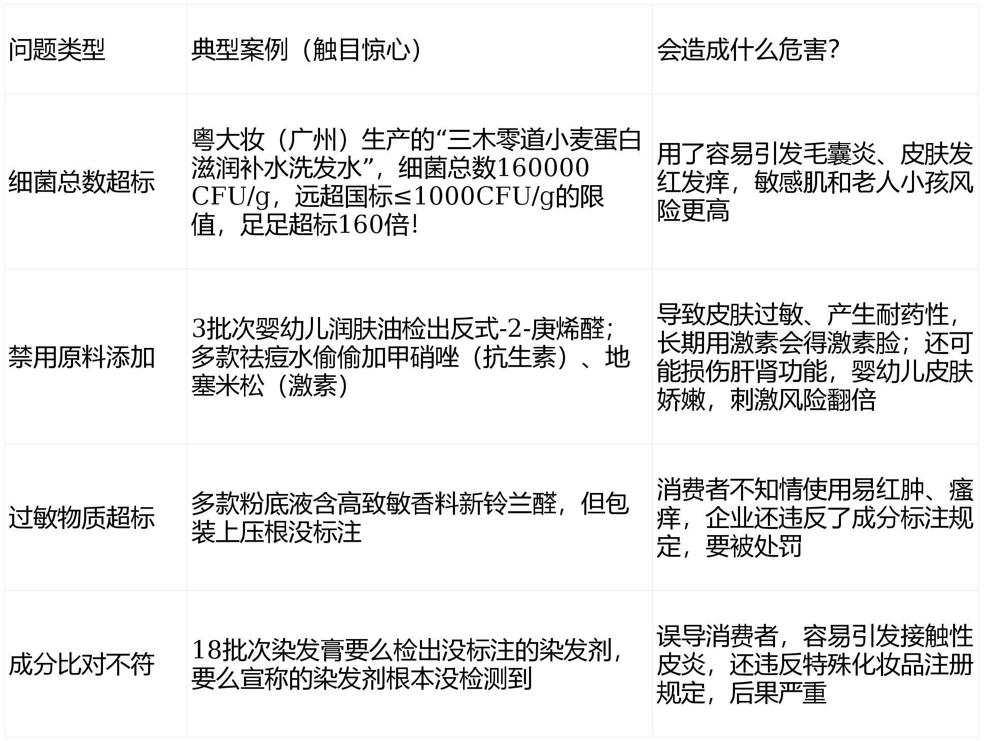 这次曝光的55批次产品,集中存在4大质量硬伤,不管是对消费者还是企业,都是“定时炸弹”,具体情况一看就懂: