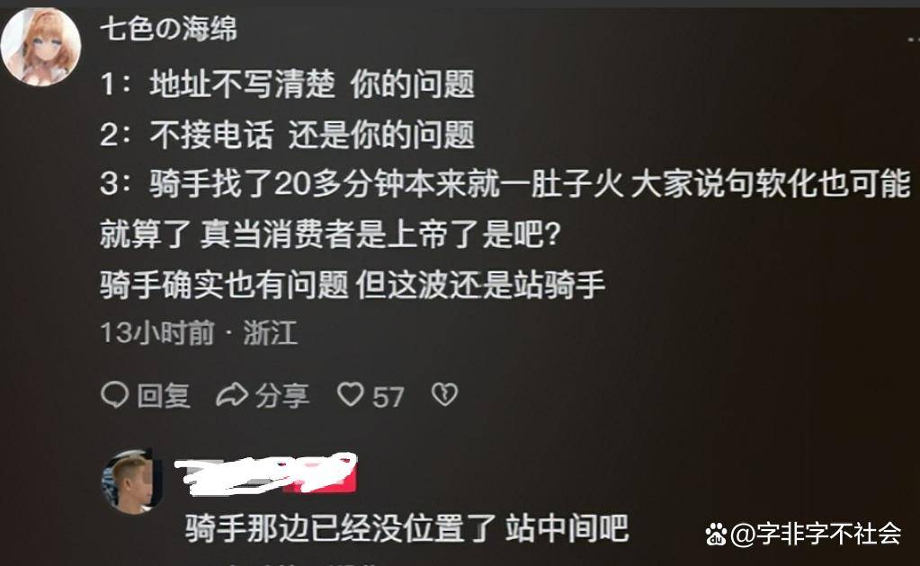 更有网友补刀:“你不仅没理,还没礼貌,小哥说的没错,你连填详细地址的义务都不愿意尽,连最基本的尊重都不懂,被劝退也是活该,别出来丢人现眼了。”