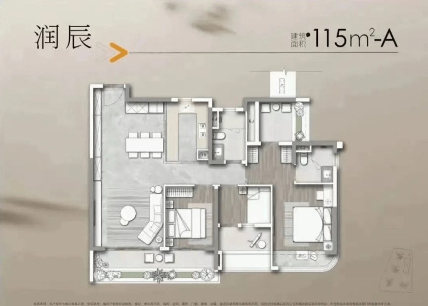 先来看115㎡A户型,该户型采用南北通透设计,客厅、餐厅位于户型中央,南北双向采光,通风效果极佳,避免了闷热潮湿的问题。客厅连接南向全景阳台,阳台长度约4.5米,宽度约1.8米,视野开阔,可俯瞰社区园林景观,同时可作为休闲区、晾晒区;餐厅连接北向阳台,可作为储物区、晾晒区,实用性强。