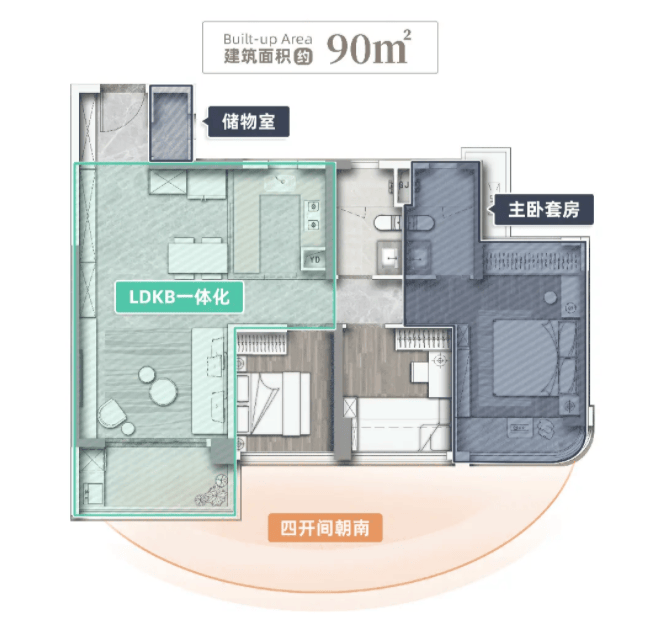该户型得房率同样超105%,空间利用率高,四开间朝南的设计的在同区域同面积段户型中十分罕见,既能满足刚需家庭的居住需求,又能提升居住的舒适度,是刚需改善家庭的优质选择。
