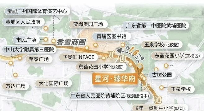 在城市发展的宏大叙事中,地段永远是衡量房产价值的第一个标尺。星河臻华府的选址,堪称教科书级别的“核心中的核心”。项目位于黄埔区云埔街道,具体坐落在开创大道与开源大道这两条城市主干道的交汇处。这一地理位置,不仅赋予了项目四通八达的交通网络,更使其成为了连接广州老城区与东部新兴增长极的关键节点。