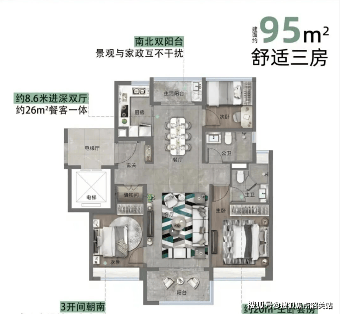 这款户型是小高层产品中的佼佼者,采用2梯2户的板式设计,南北通透,通风采光极佳。双阳台的设计巧妙地区分了生活区与景观区,既满足了晾晒衣物的实用需求,又提供了观景休闲的惬意空间。三开间朝南,近10米的南向面宽,让阳光洒满整个客厅和卧室。卧室飘窗全赠送,极大地提高了空间利用率。对于年轻夫妇或小家庭来说,这款户型紧凑实用,功能齐全,是上车的首选。