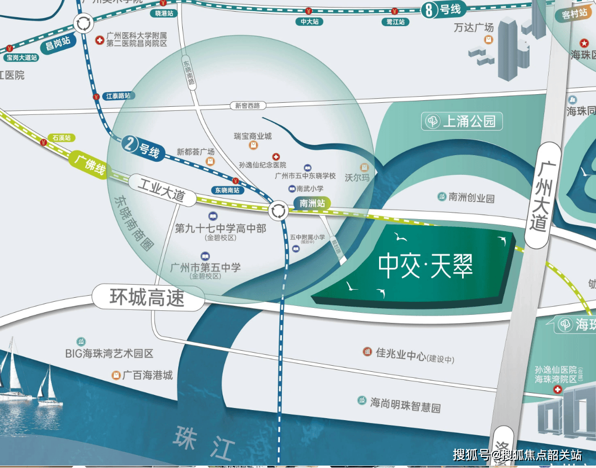 在城市发展的宏大叙事中,地段的选取往往决定了资产的长期价值。中交天翠所处的位置,堪称海珠区乃至整个广州南部的“皇冠明珠”。项目坐落于广州大道南1818号,这里不仅是地理坐标上的重要节点,更是城市功能布局的关键枢纽。它恰好位于广州新中轴线与珠江后航道的交汇处,这种“双轴交汇”的地理特征,赋予了项目得天独厚的战略优势。