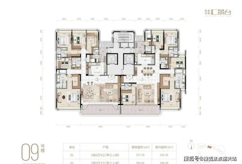 9栋和10栋的户型布局相近,分别涵盖277-290平方米的五房三卫。这两款户型在设计上更加注重家庭成员的独立空间与互动需求的平衡。