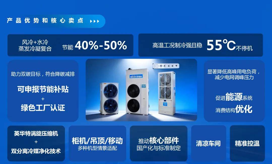 在技术方面,美博工业空调采用英华特涡旋压缩机与双分离冷媒净化技术,可适配柜机、吊顶机等多种安装场景。其风冷/水冷蒸发冷凝复合技术,能够实现节能40%-50%,显著降低高峰用电负荷,缓解电网调峰压力。各类应用场景若选用美博工业空调,还可申报节能补贴与绿色工厂认证。因此,该产品成为工业、科研、商业等多类场景下制冷空调的优选方案。