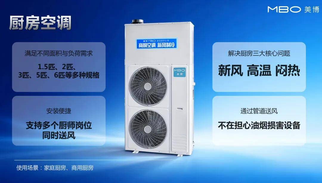 美博现阶段的工业空调主要有三大品类,第一类是厨房空调。适用场景是商用厨房及家用厨房;第二类是工业空调。适用车间厂房、运动场馆、超市餐厅、车站候车室等。第三类是双冷凝工业空调,具备更广泛的适应性,可应对多种复杂环境需求。据相关人员介绍,随着美博在工业空调上探索挖掘的深入,还会有更多适用场景产品的不断落地。
