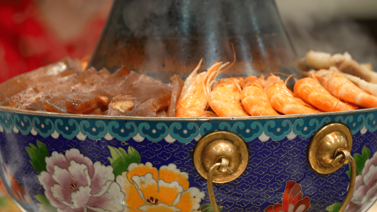 山海关浑锅,又称红锅、荤锅,融合了东北炖菜与本地海鲜精华。传统浑锅以酸菜、黄花菜、海带为底,依次码上丸子、焖子、鸡肉、排骨,再点缀花蛤、小螃蟹等海鲜,食材最多可达24种,这道“硬菜”,为春节里的人们增添了更多暖意。