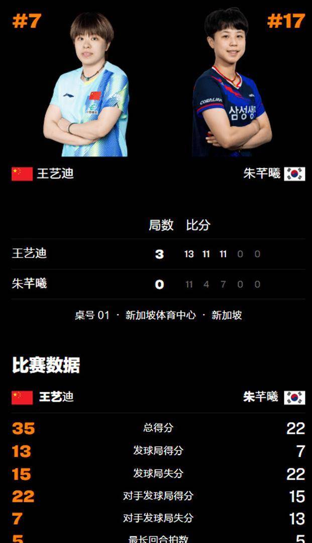 第三局成为王艺迪的个人秀场。 她延续火热状态,开局便以3-0领先,迫使朱芊曦叫出暂停进行调整。 但暂停并未改变比赛走势,重新回到赛场的王艺迪依旧攻势不减,将比分拉开至7-3。 朱芊曦虽然奋力追分,但始终无法突破王艺迪的防线。 王艺迪稳扎稳打保持优势直至局末,最终以10-7领先拿到赛点,随后再得1分以11-7结束战斗。 整场比赛,王艺迪的正手暴力弧圈命中率高达72%,彻底击穿了朱芊曦的防守体系。 后两局她仅让对手合计得到11分,展现出了绝对的统治力。 这场胜利也延续了她2025年斩获5冠的强势状态。