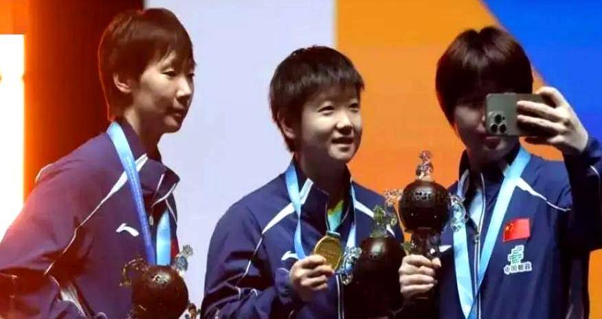更有戏剧性的是,球台对面的王曼昱也伸出了手指,但她指的方向是下面,是球台的侧面。
